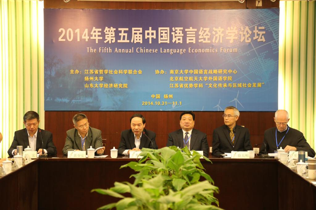2014年10月31日至11月2日,第五届中国语言经济学论坛在扬州大学召开。扬州大学校长焦新安教授、语言经济学论坛理事长黄少安教授出席开幕式并致辞。文学院院长柳宏教授主持开幕式。
