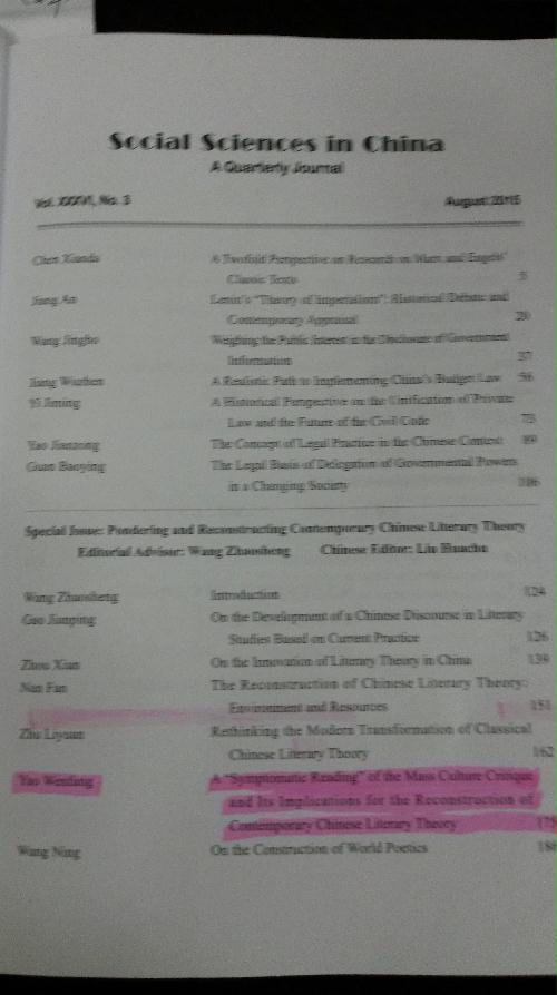 近悉,我院姚文放教授发表在《中国社会科学》2015年第4期的论文《大众文化批判的“症候解读”对当代中国文论重建的启示》又被《中国社会科学》英文版2015年第3期收录,整篇文章被翻译成英文对外宣介,开创了我院教师论文对外译介的先河。