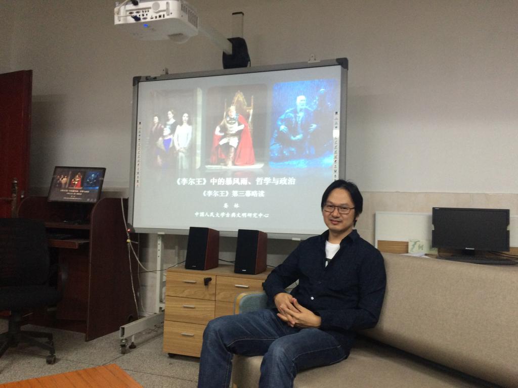 娄林老师的报告以莎剧名篇《李尔王》中第三幕“暴风雨”一段为核心,结合对剧情的分析和援引大量研究材料,娄老师犹如抽丝剥茧一般地为大家呈现出莎士比亚在写作剧本时可能赋予“暴风雨”这一意象的四层含义——暴风雨既是自然界的风暴,也指涉李尔王内心的风暴,而王者内心的风暴必然导致王国政治的动荡,也即是国家的风暴。在指出这三层风暴的含义之后,娄林老师提出了一个很有意思的问题:李尔王的传说古而有之,值得注意的是,莎士比亚在改编民间传说时,特意增加了这段“暴风雨”中的情节,此举究竟有何意图?娄林老师认为,这莎士比亚的改编为我们看清剧中隐含的第四层风暴指明了线索。结合当时的英国历史背景与政治形式,娄林老师推测,这第四层风暴投影了当时席卷欧洲的思想论争,即传统“神学-伦理”意识与新的自然哲学思潮之间的争斗。在这个问题意识的引导下,娄林老师进一步对比和分析了剧中两位主要角色李尔王与埃德蒙,为我们通过阅读莎士比亚戏剧来了解当时的思想论争提供了指引。