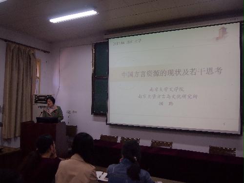 顾教授由扬州文化谈到语言艺术,提出语言是不可再生的文化资源和珍贵的非物质文化遗产。她还向同学们介绍,我国境内有130多种语言,且68种语言的使用人口在万人以下,满语、赫哲语、苏龙语等使用人数不足百人,汉语方言的生存状况日趋严峻。