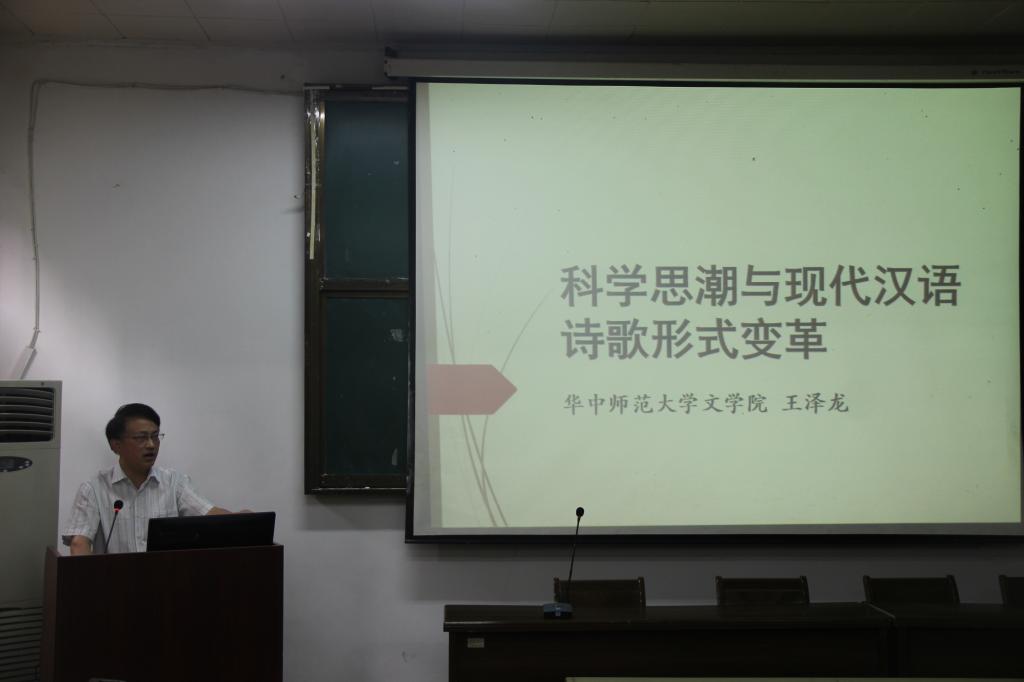 2017年6月8日下午三点,王泽龙教授在文学院团委报告厅给我院师生带来了一场题目为《科学思潮与现代汉语诗歌形式变革》的讲座,文学院院长陈军教授主持本次讲座。王教授现为华中师范大学文学院教授、博士生导师、教育部长江学者特聘教授,任湖北省中国现代文学学会会长、中国闻一多研究会副会长、华中师范大学诗歌研究中心主任、中国现代文学研究会理事等职务。
