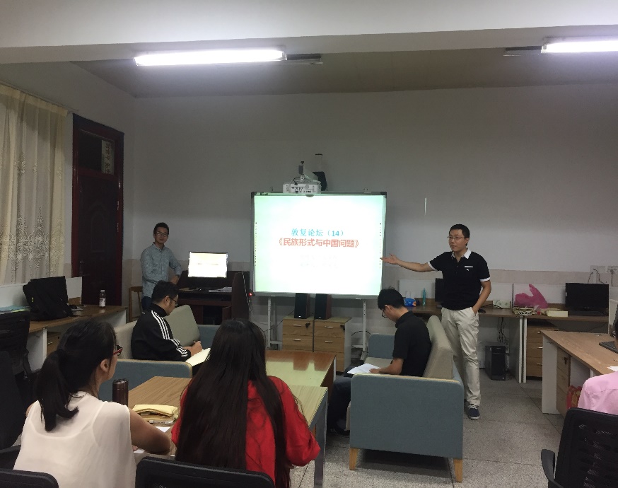我院敦复青年学者论坛第十四期活动于2017年9月28日如期举办。本期主讲人是现当代文学教研室的熊庆元博士,报告题为:“民族形式与中国问题:人民战争条件下的文艺‘民族形式’论争”。活动由张雷博士主持,并邀请新闻与传媒学院邓良博士和我院杨宁宁博士点评。