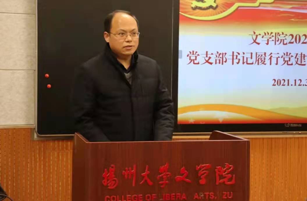 张立兵书记对教职工第一党支部的年度情况进行汇报。该支部以庆祝中国共产党成立100周年为主线,将学习十九届六中全会等会议精神贯彻在日常的支部学习中,并专门前往盐城市新四军纪念馆开展“学百年党史,传千秋文脉”党日活动。