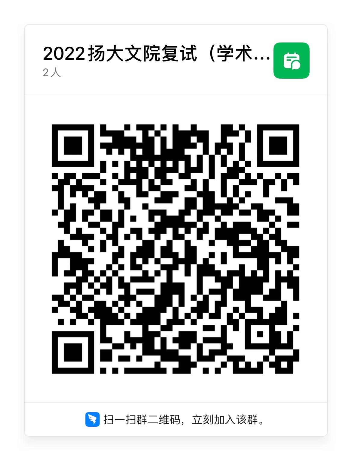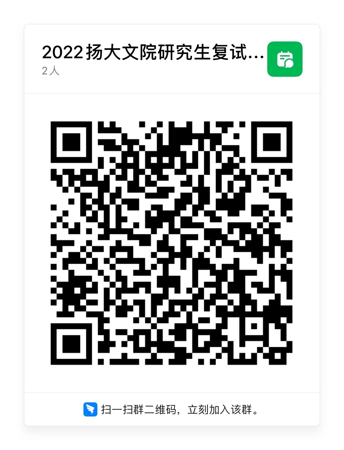 达到复试分数线的考生请对照报考类型,分别加入“2022扬大文院研究生复试(学术型)通知群”,及“2022文学院研究生复试(专业型)通知群”,该钉钉群将用以发布与复试相关的通知信息,及作为学信网“招生远程面试系统”的备用手段。所有人必须以报考专业名称+真实姓名备注,否则不予通过。请考生通过钉钉群及时收取各专业复试通知。