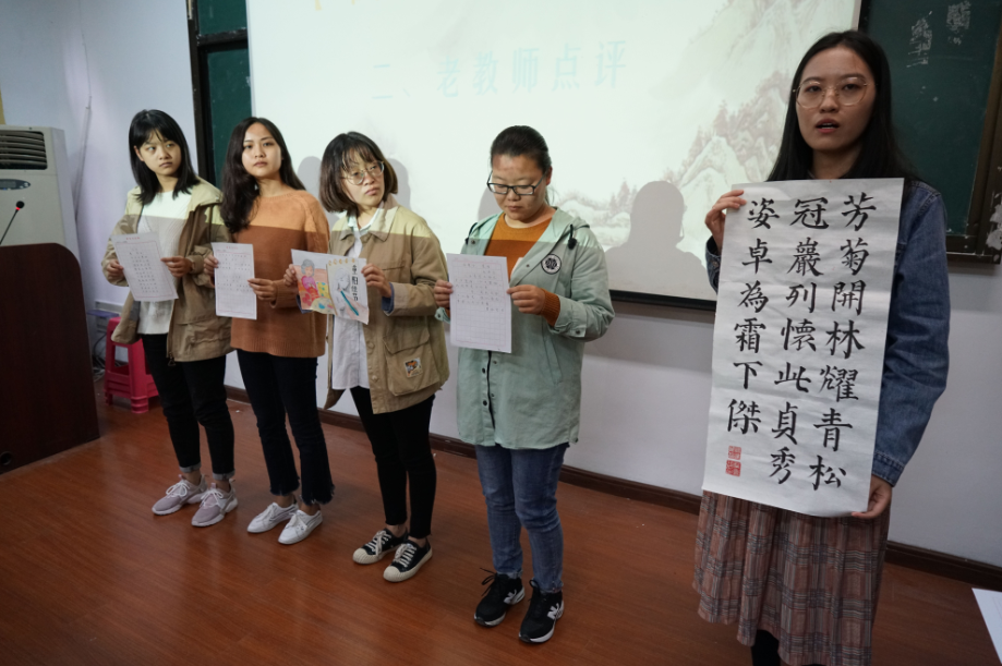 班吉庆老师对书画作品给予了高度肯定:“两个班同学的书画水平都很高,点画严整、字字有力,需要注意的是落款、印章之类的细节问题。”