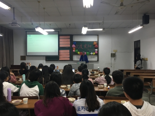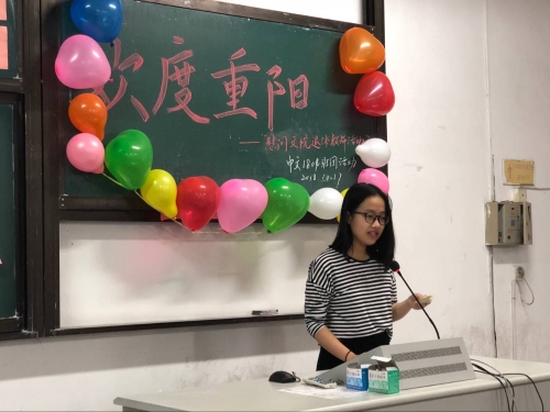 随后,团日活动正式拉开帷幕,主持人王克斗、陈驰为大家讲述了有关重阳节的传说故事。接着,同学们纷纷登台,胡静枫、谭语嫣带来的歌曲演唱、陈思源的葫芦丝独奏、以及古筝配乐诗朗诵等一个个精彩的节目,不仅活跃了气氛,也展现了当代大学生的风采。由留学生们所带来的《九月九日忆山东兄弟》诗朗诵,以及穿插的互动环节——猜谜语、为文院退休教师手写祝福等节目,更将活动推向了高潮。在同学们的精心策划与准备下,整场活动掌声连连,活动在一片欢乐祥和的氛围中圆满结束。