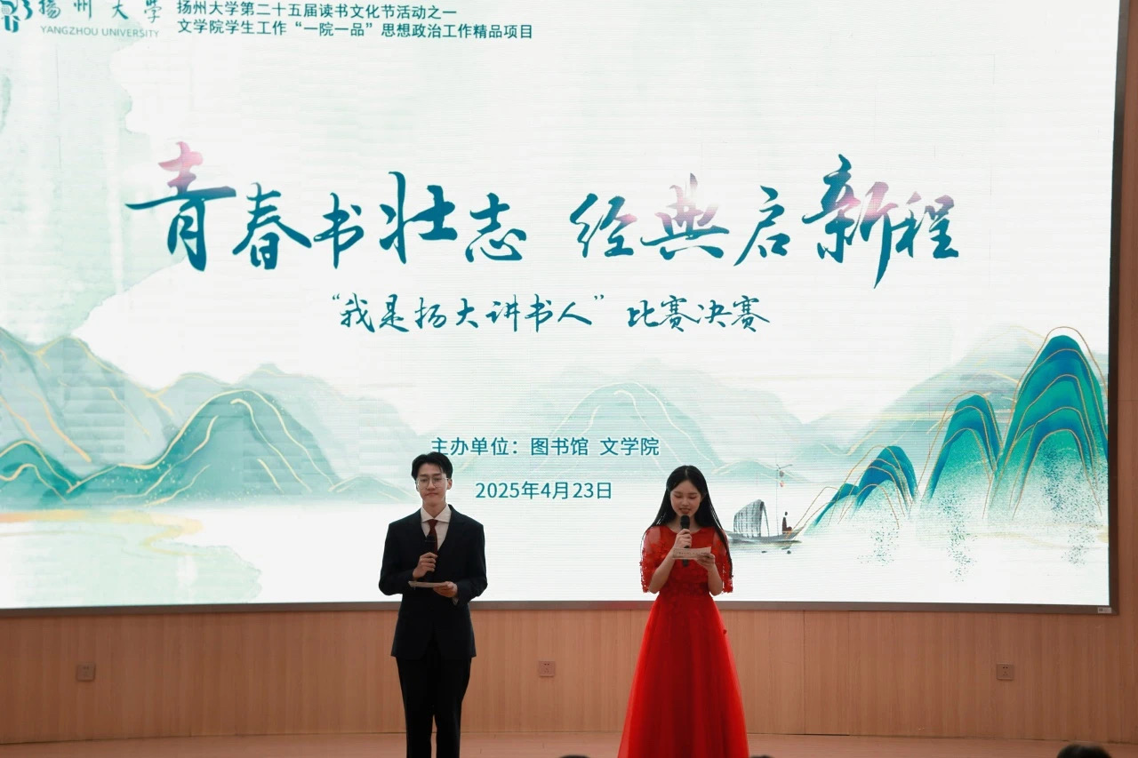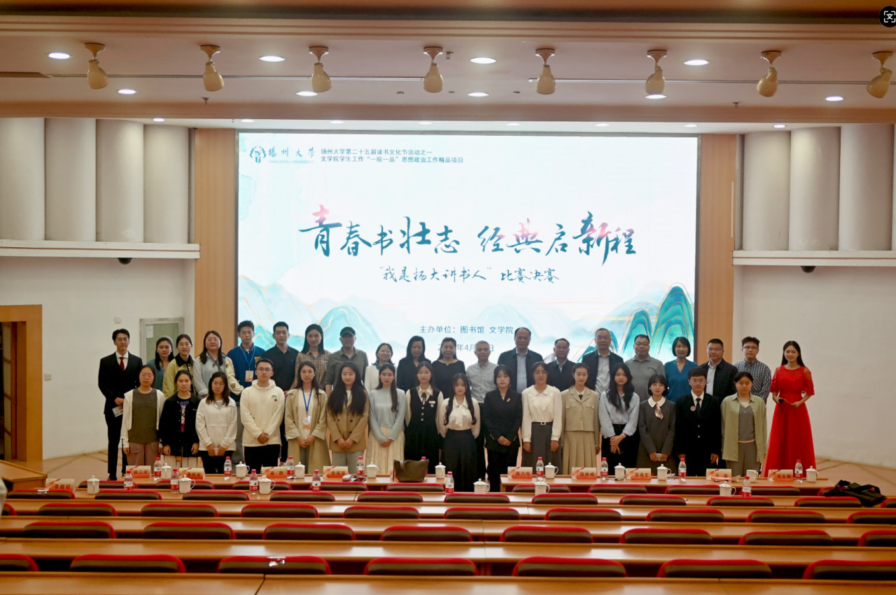 4月23日晚上7点,我校第二十五届读书文化节开幕式暨“青春书壮志 经典启新程——我是扬大讲书人”比赛决赛在荷花池校区逸夫图书馆报告厅隆重举行。校党委常委、副校长蒋乃华,机关党委书记甘袁雯,学生工作部部长、学生工作处处长施林峰,教务处副处长俞福丽,研究生工作部副部长居再宏,校工会副主席高静,校团委副书记王敏,图书馆馆长、党总支书记侯三军,文学院党委书记李怀军,图书馆副馆长周玉陶,文学院教授、博士生导师李徽昭,各学院师生代表以及图书馆的老师们出席本次活动。