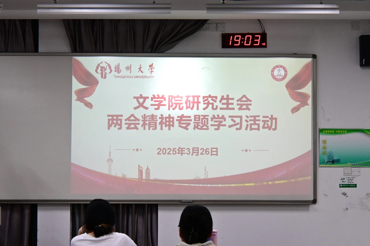 为深入学习贯彻2025年全国两会精神,鼓励新时代青年树立远大理想,明确自身在实现中华民族伟大复兴进程中的责任与使命,2025年3月26日晚7点,扬州大学文学院研究生会于瘦西湖校区8号楼S102开展了2025年全国两会精神学习交流会。本次活动由主席团劳叶煖主持,研会全体成员参与。三位主讲人分别是主席团代表劳叶煖、部长团代表朱颖和志愿者代表张馨云。