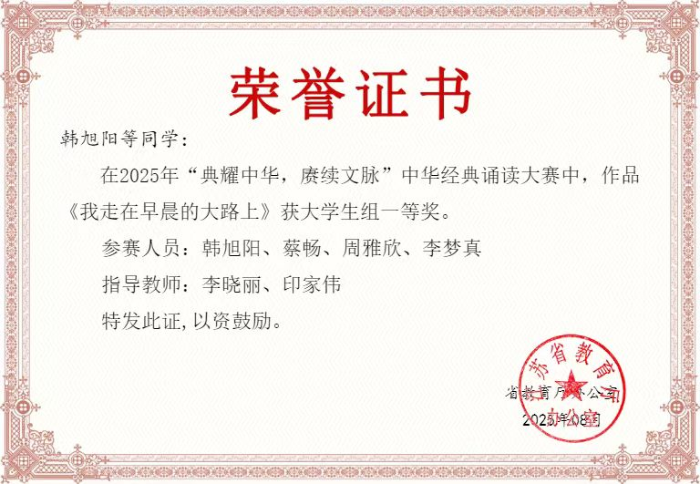 韩旭阳、蔡畅、周雅欣、李梦真同学参赛作品《我走在早晨的大路上》荣获江苏省大学生组一等奖、全国大学生组优秀奖(指导老师:李晓丽、印家伟)。